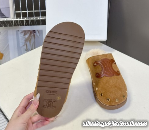 Popular Style Celine Pitea Clog Flat Mules in Suede and Wool with Studs Brown 1024055