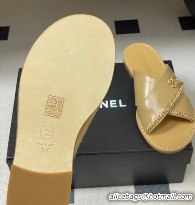 Best Price Chanel Calfskin Leather Flat Slides Sandal with Chain G46976 Beige 2026