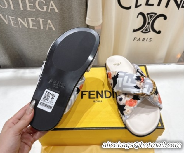 > Shoes Plaza > Fendi Shoes > Shop Duplicate Fendi Feel Flat Slides Sandal in Printed FF Fabric with D-ring Buckle White 51216062