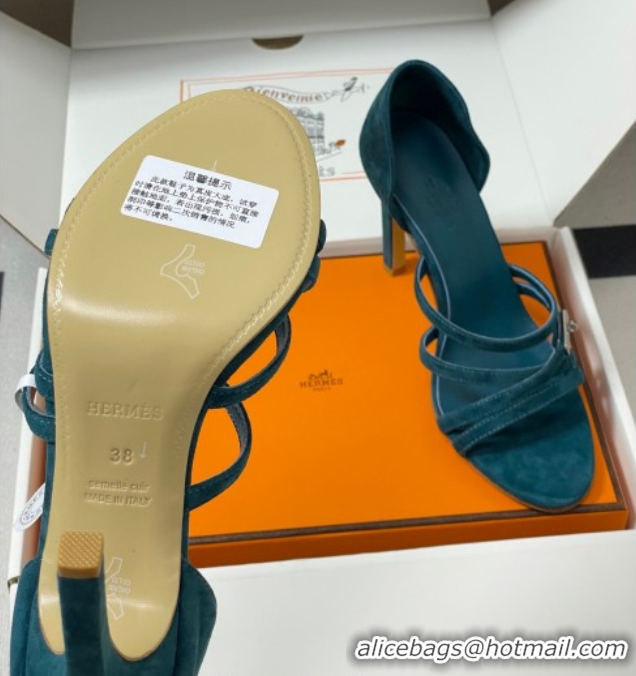 Low Price Hermes Lipstick Heel Sandals 10.5cm with Kelly Buckle in Suede Green 1023179