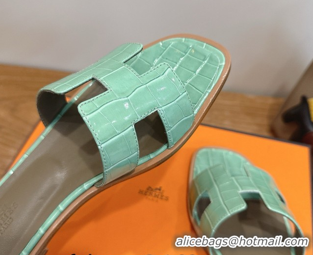 Buy Luxury Hermes Oran Classic Flat Slides Sandal in Crocodile Embossed Leather Light Green 0304076
