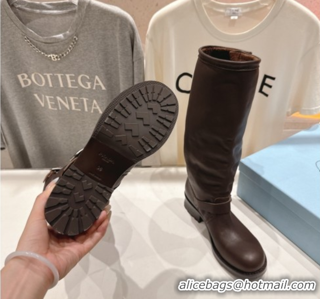 Low Price Prada Leather Flat High Boots with Buckle Brown 2025 PR102703 1027073
