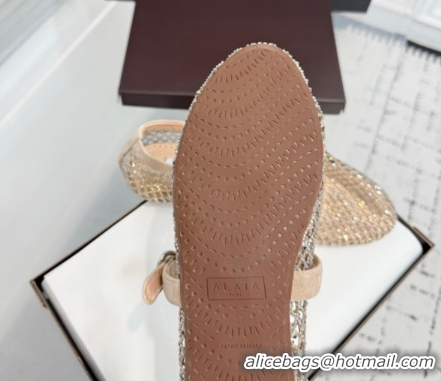 Luxurious Alaia Ballet Flats in Fishnet and Suede with Strass Beige AL020702