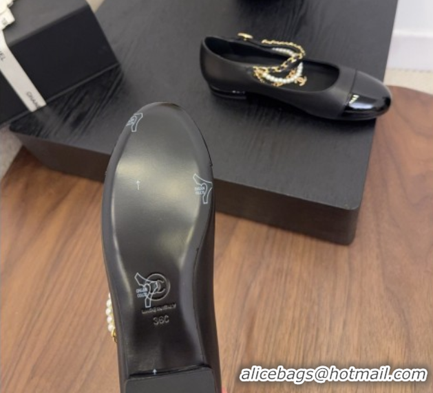 Luxurious Chanel Lambskin & Patent Calfskin Mary Janes Ballet Flats with Chain and Pearls Black 2025 G46718