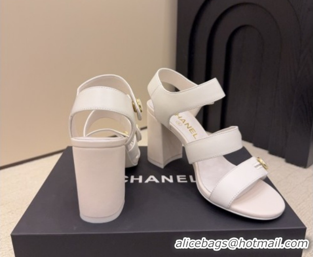 Luxurious Chanel Shiny Calfskin Leather Heel Sandals 8cm with Button Strap 5G46793 White 2026