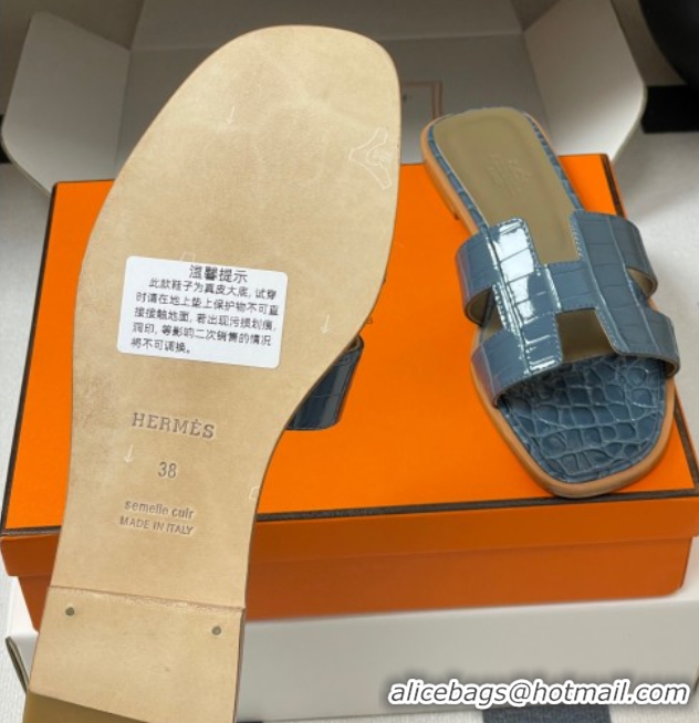 Luxurious Hermes Oran Classic Flat Slides Sandal in Crocodile Embossed Calfskin Blue 2025 H081803