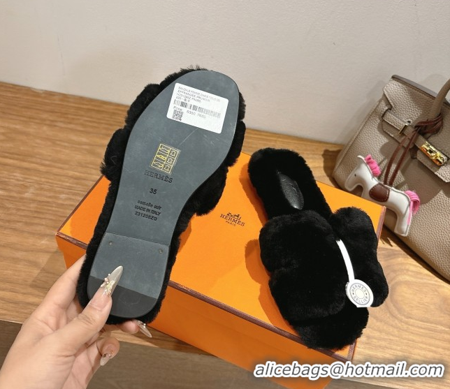 Luxurious Hermes Oran Sandals in Shearling Wool H101612 Black