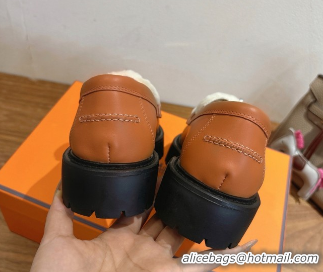 Purchase Hermes Icone Platform Loafers in Calfskin and Shearling with Kelly Buckle Brown 1023005