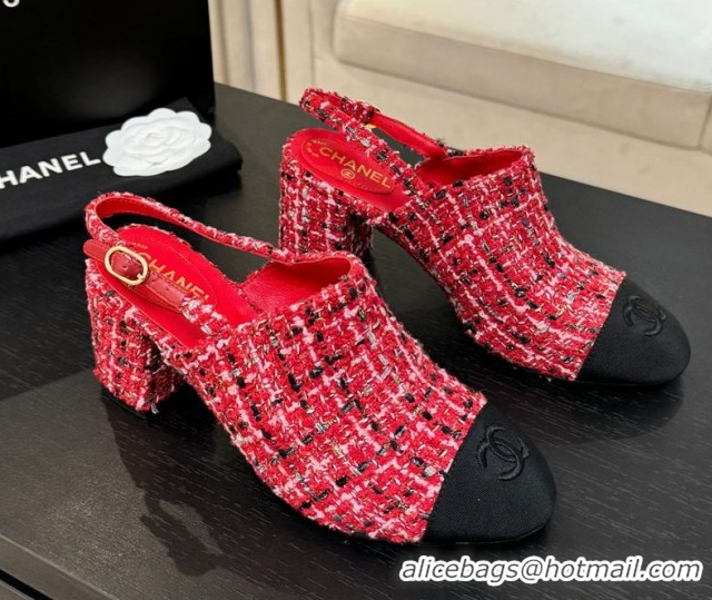 Best Price Chanel Cotton Tweed & Grosgrain Slingbacks Pump 6.5cm Red2 G46865 1103046