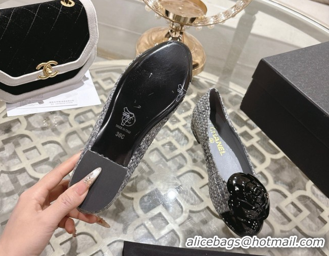 Luxury Cheap Chanel Tweed & Patent Leather Ballet Flats with Camellia Bloom CH030704 Grey 2026