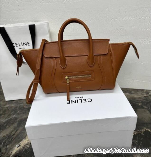 Luxury Cheap Celine Small New Luggage in Supple Shiny Lambskin 124213 Tan Brown 2025