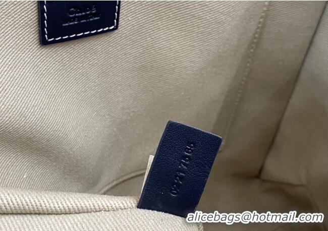 Luxury Cheap Chloe Medium Woody Tote Bag in Linen Canvas and Calfskin Leather 1120 Dark Blue 2025