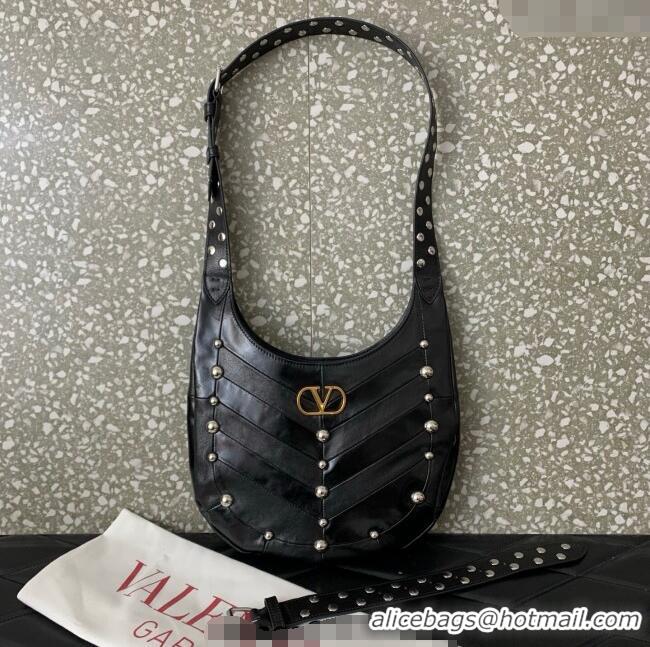 Grade Design Valentino Hoboho Small Hobo Bag In Chevron-Patterned Nappa Leather with Studs 0073S Black 2025