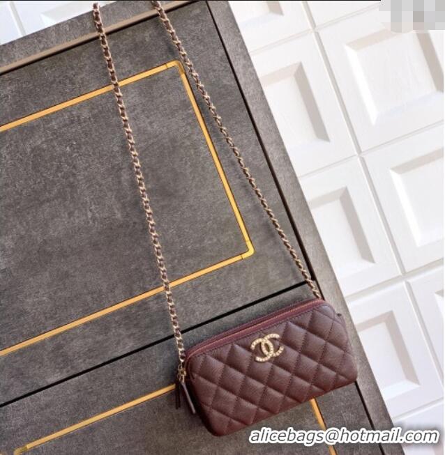 Luxury Discount Chanel Grained Calfskin Zipped Phone Holder with Chain and Strass CH101102 Coffee Brown 2025