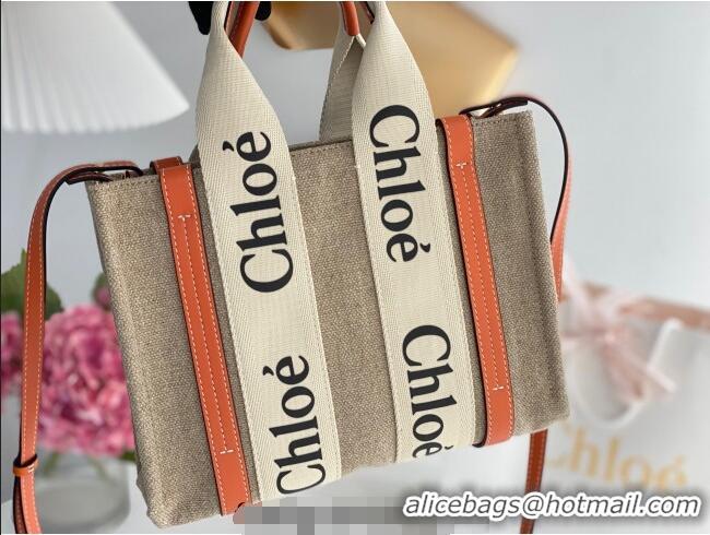> Chloe Handbag > Luxury Discount Chloe Small Woody Tote Bag in Linen Canvas and Calfskin Leather 1120 Orange 2025