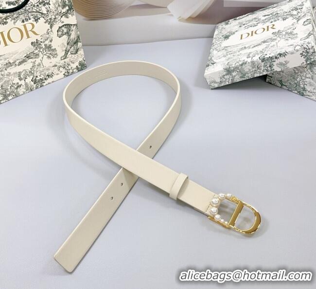Inexpensive Dior Calfskin Leather Belt 3cm with Pearls CD Buckle Ivory 0108 White/Gold 2025