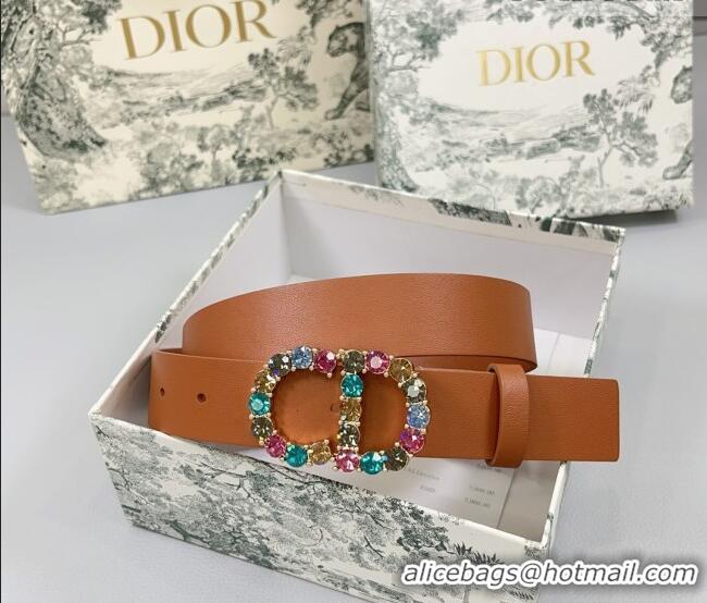 Luxury Discount Dior Calfskin Leather Belt 3cm with Strass CD Buckle 0108 Brown 2025