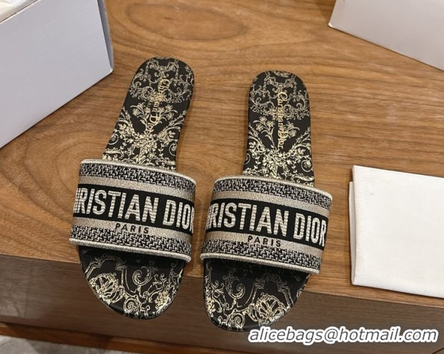 Sophisticated Dior Dway Flat Slides Sandal in Cotton Embroidered with Metallic Thread and Black and Gold-Tone Floral Motif 2026 0302112