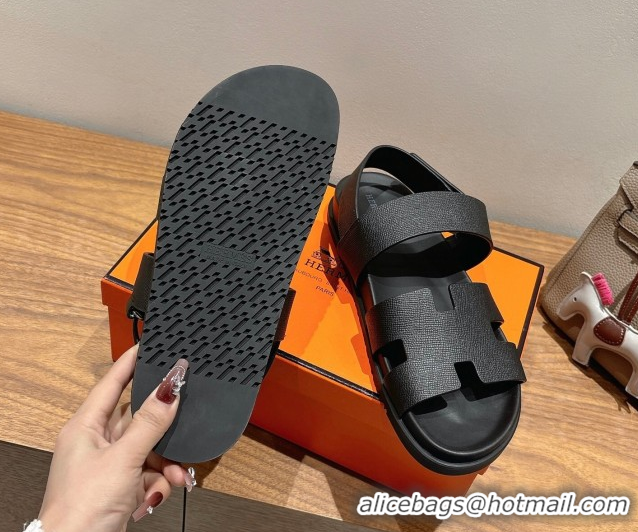 Luxury Hermes Genius Strap Sandals in Grained Leather Black H082011 0820165