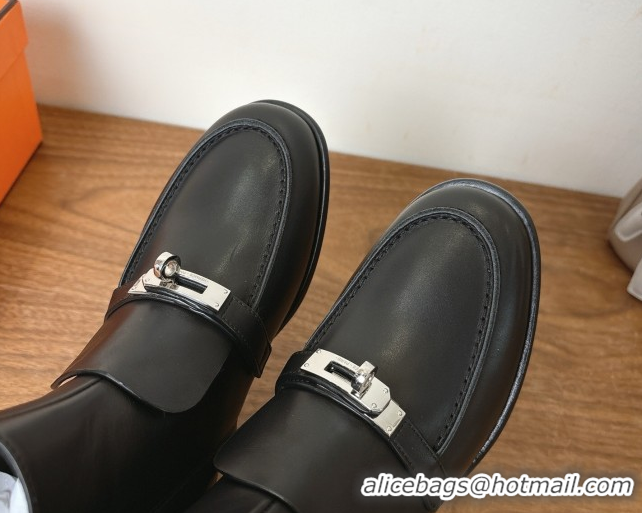 Luxury Hermes Kelsy Flat Ankle Boots in Calfskin Leather with Kelly Buckle Strap Black 1023048