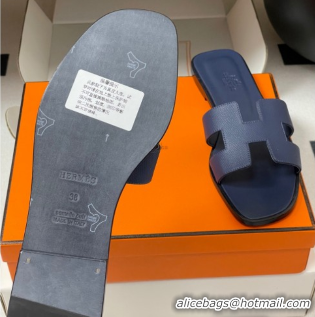 Luxury Cheap Hermes Oran Classic Flat Slides Sandal in Palm-Grained Calfskin Dark Blue 0819013