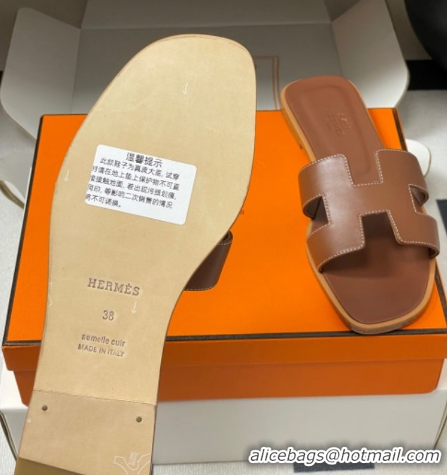 Luxury Hermes Oran Classic Flat Slides Sandal in Smooth Calfskin Brown 2025 H081803