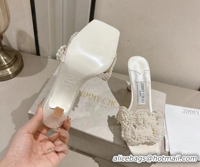Luxury Jimmy Choo Cary Heel Slides Sandal 7cm in Satin with Pearl Embellishments White 1031024