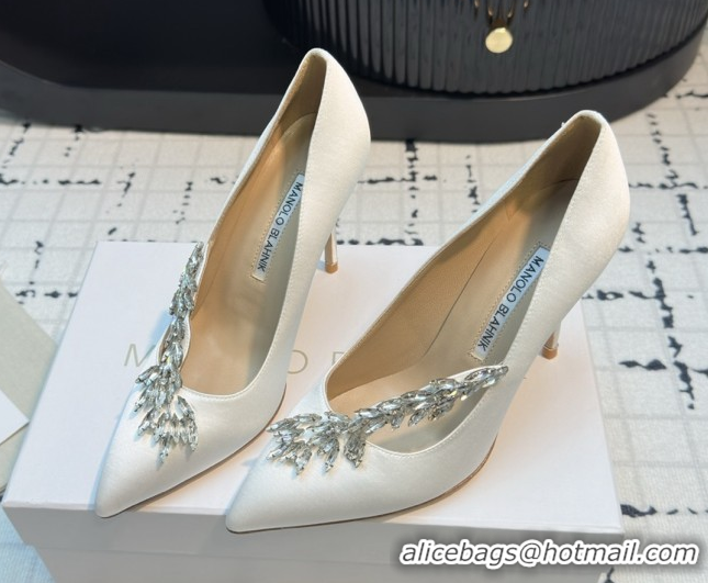 Luxury Manolo Blahnik Satin Pumps with Wheat Ear Rhinestone 9cm Heel White 5112511 2026
