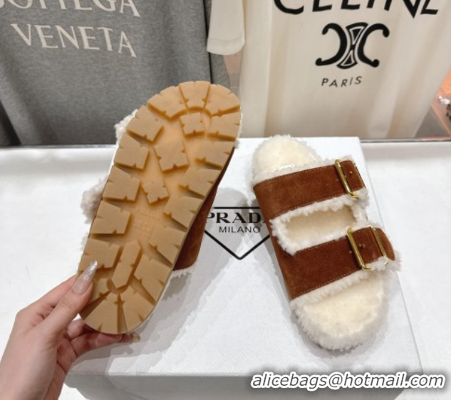 Your Position: Home > Shoes Plaza > Prada Shoes > Luxury Prada Suede & Shearling Strap Slides P121603 Brown 121603 2026
