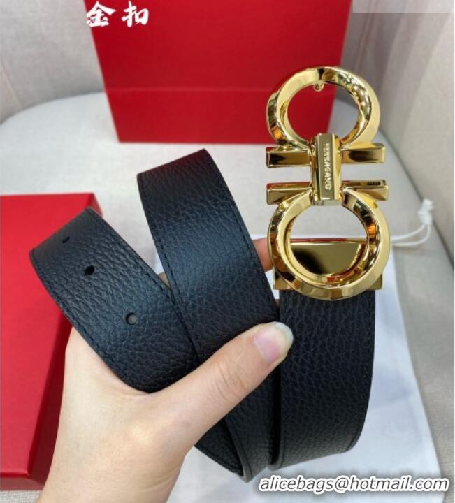Market Sells Ferragamo Belt 3.5cm in Reversible Litchi-Grained and Smooth Leather 0615 Black/Shiny Gold