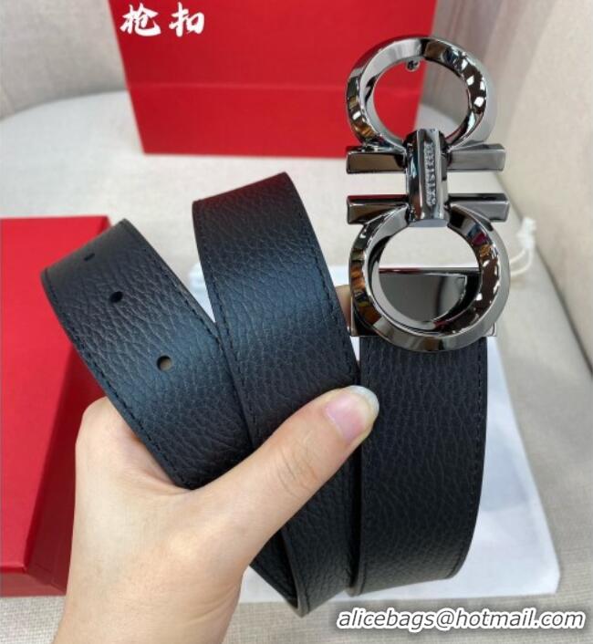 High Quality Ferragamo Belt 3.5cm in Reversible Litchi-Grained and Smooth Leather 0615 Black/Shiny Gunmetal