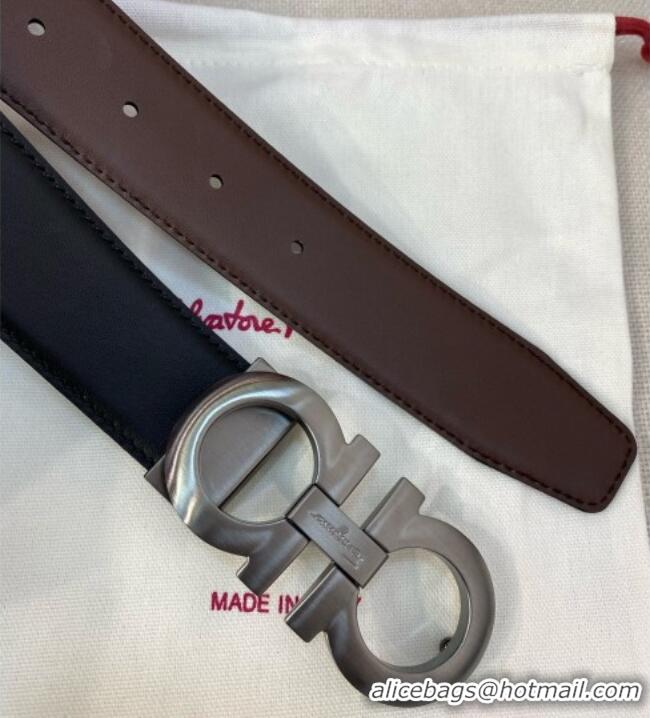 New Cheap Ferragamo Belt 3.5cm in Reversible Soft Leather 0615 Black/Light Coffee/Shiny Gunmetal