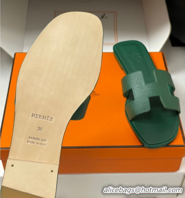 Cheap Price Hermes Oran Classic Flat Slides Sandal in Palm-Grained Calfskin Deep Green H081803