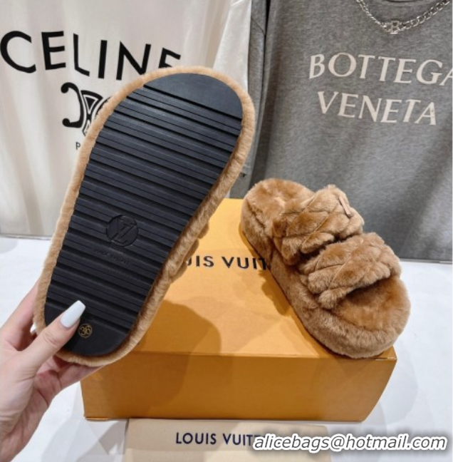 Discount Louis Vuitton LV Bliss Comfort Shearling Platform Slides Sandal Brown LV082906 0829117