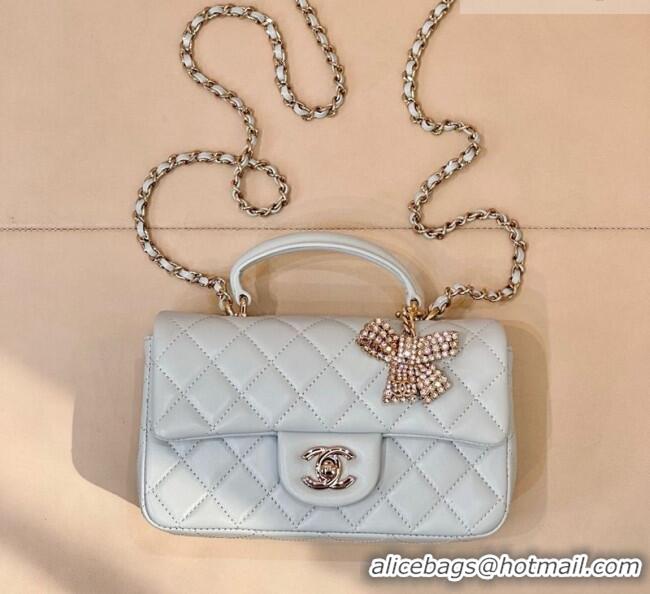 New Design Chanel Lambskin Leather Mini Classic Flap Handbag With Top Handle and Bow Charm AS2431 Light Blue 2026