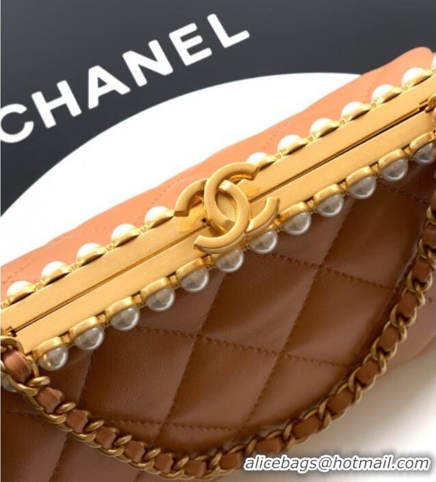 New Design Chanel Lambskin Leather & Pearls Clutch with Chain AS5912 Caramel Brown 2026