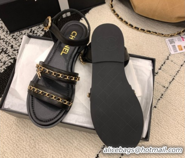 Perfect Chanel Calfskin Leather Flat Sandals with Chain Black G46801