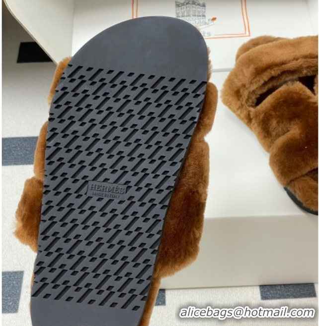 Fashion Luxury Hermes Chypre Flat Slides Sandal in Wool Brown H102306 1023114