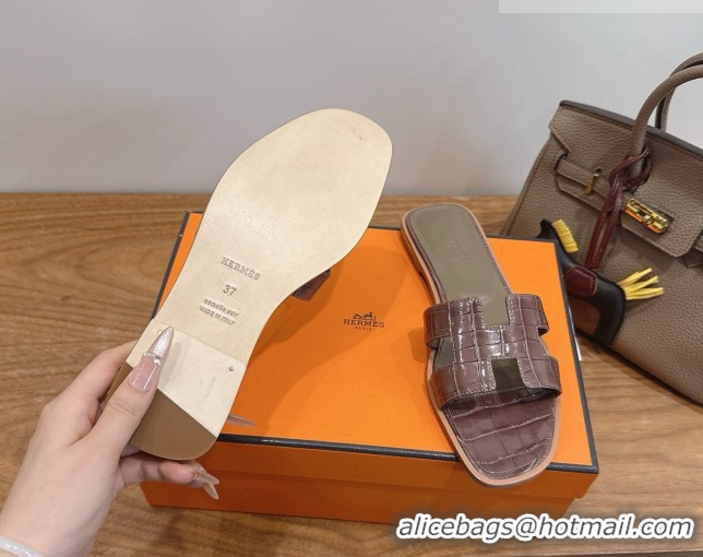 Grade Hermes Oran Classic Flat Slides Sandal in Crocodile Embossed Leather Chocolate 0304078