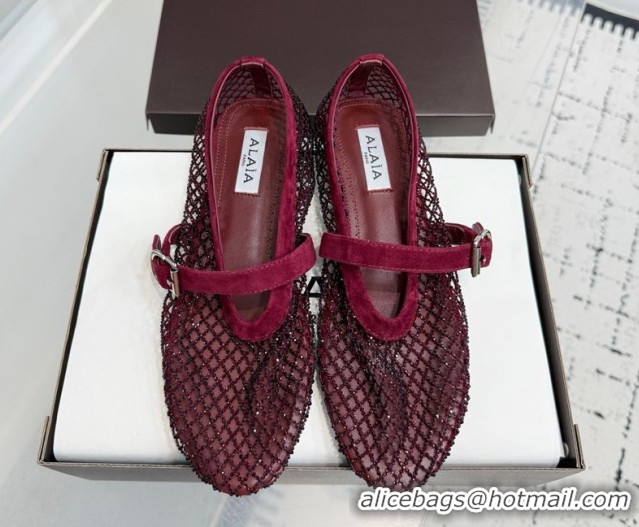 Unique Style Alaia Ballet Flats in Fishnet and Suede with Strass Burgundy  2026 AL020702