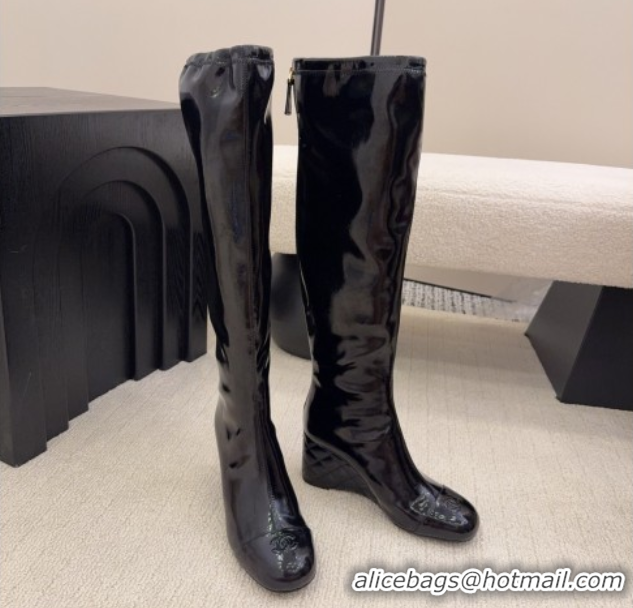 Popular Style Chanel Patent Leather Wedge Thigh High Boots Black 2025 CH110322 1103156