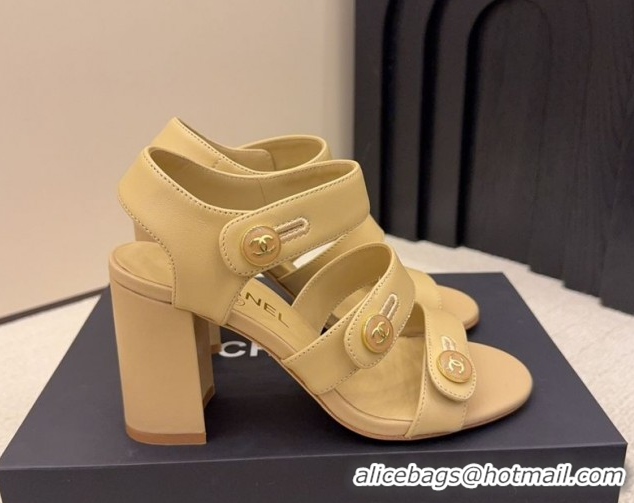 Popular Style Chanel Shiny Calfskin Leather Heel Sandals 8cm with Button Strap G46793 Beige 2026