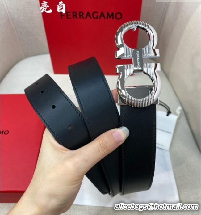 Cheapest Ferragamo Belt 3.5cm in Reversible Smooth Leather with Embossed Buckle 0615 Black/Shiny Silver