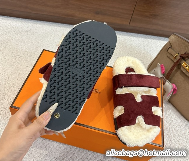 > Shoes Plaza > Hermes Shoes > Shop Duplicate Hermes Chypre Flat Slides Sandal in Suede and Shearling Burgundy H102307 1023120