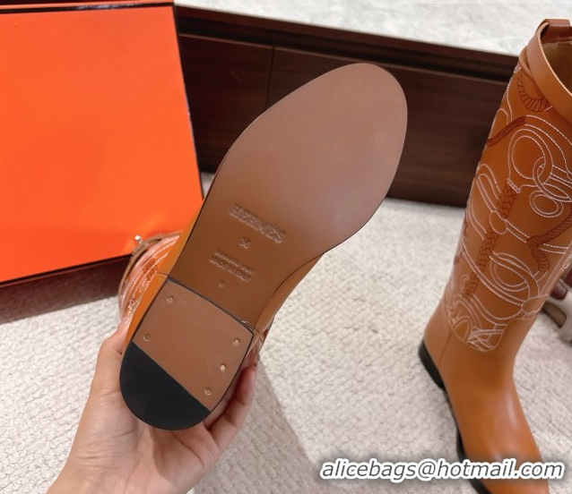 Popular Style Hermes Jumping High Flat Boots in Embroidered Calfskin with Kelly Buckle Strap H252158 Tan Brown 2026