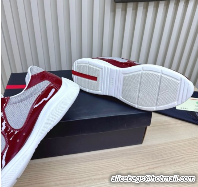 Popular Style Prada Men's America's Cup Bike Patent Leather and Fabric Sneakers Burgundy 2025 3E6420 1027120