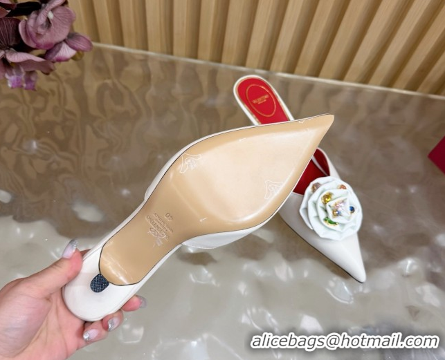 Good Quality Valentino Calfskin Leather Heel Mules 5.5cm with Strass Stones and Rose Blossom White 2025 VLTN121503 12150