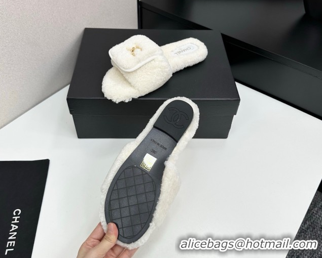 Durable Chanel Shearling Wool Flat Slides Sandal with Foldover White 2025 CH103106 1031127