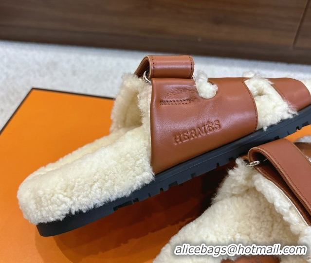 Pretty Style Hermes Chypre Flat Slides Sandal in Calfskin Leather and Shearling Brown H102307 1023125