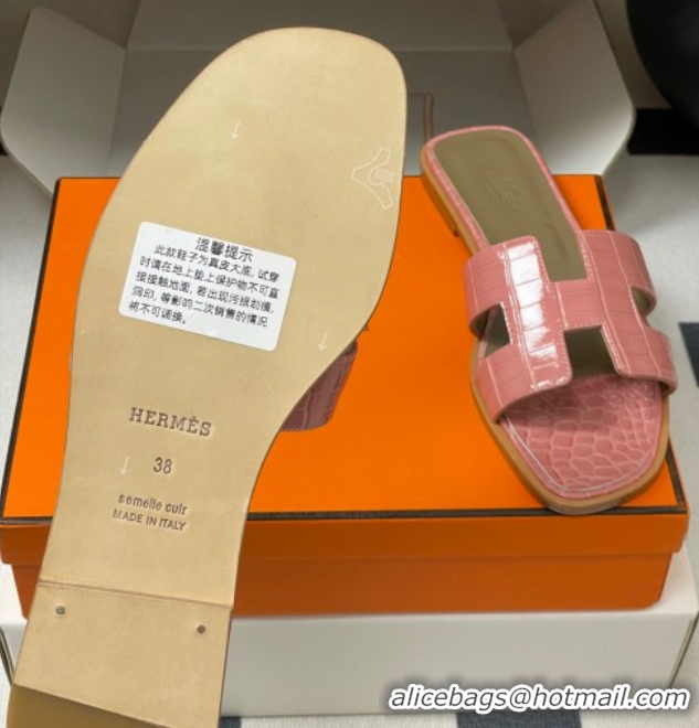 Pretty Style Hermes Oran Classic Flat Slides Sandal in Crocodile Embossed Calfskin Light Pink 2025 H081803